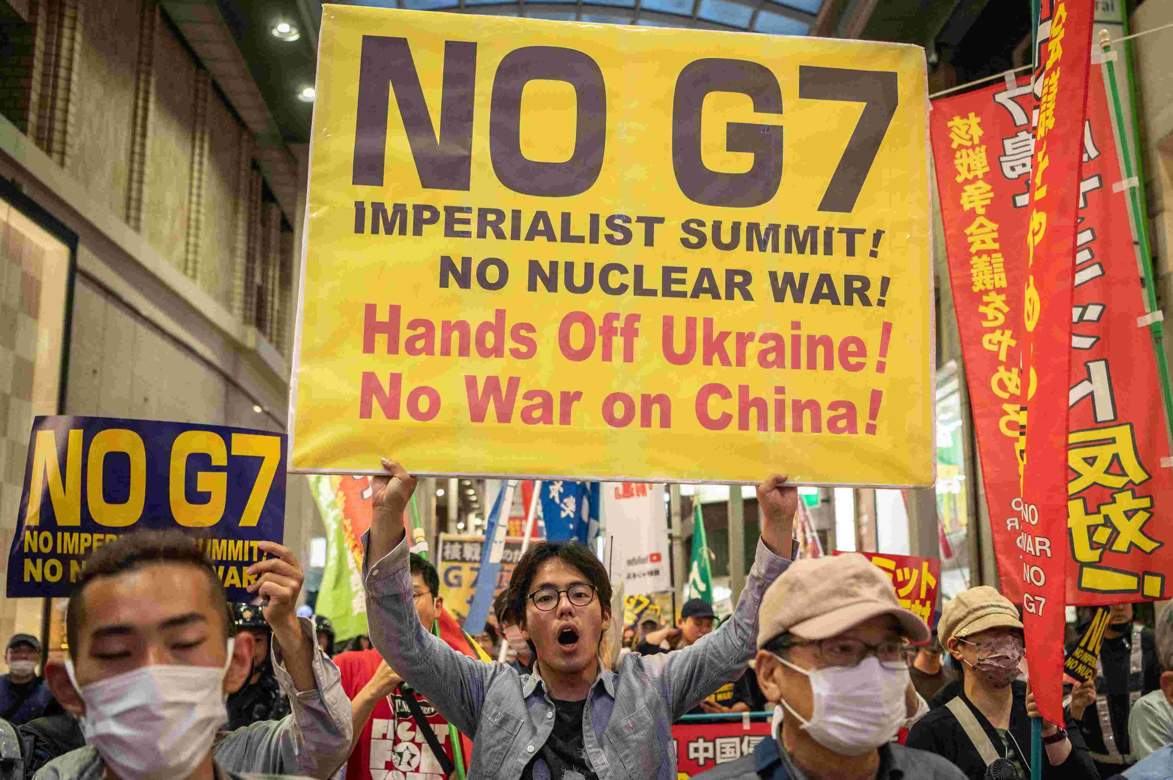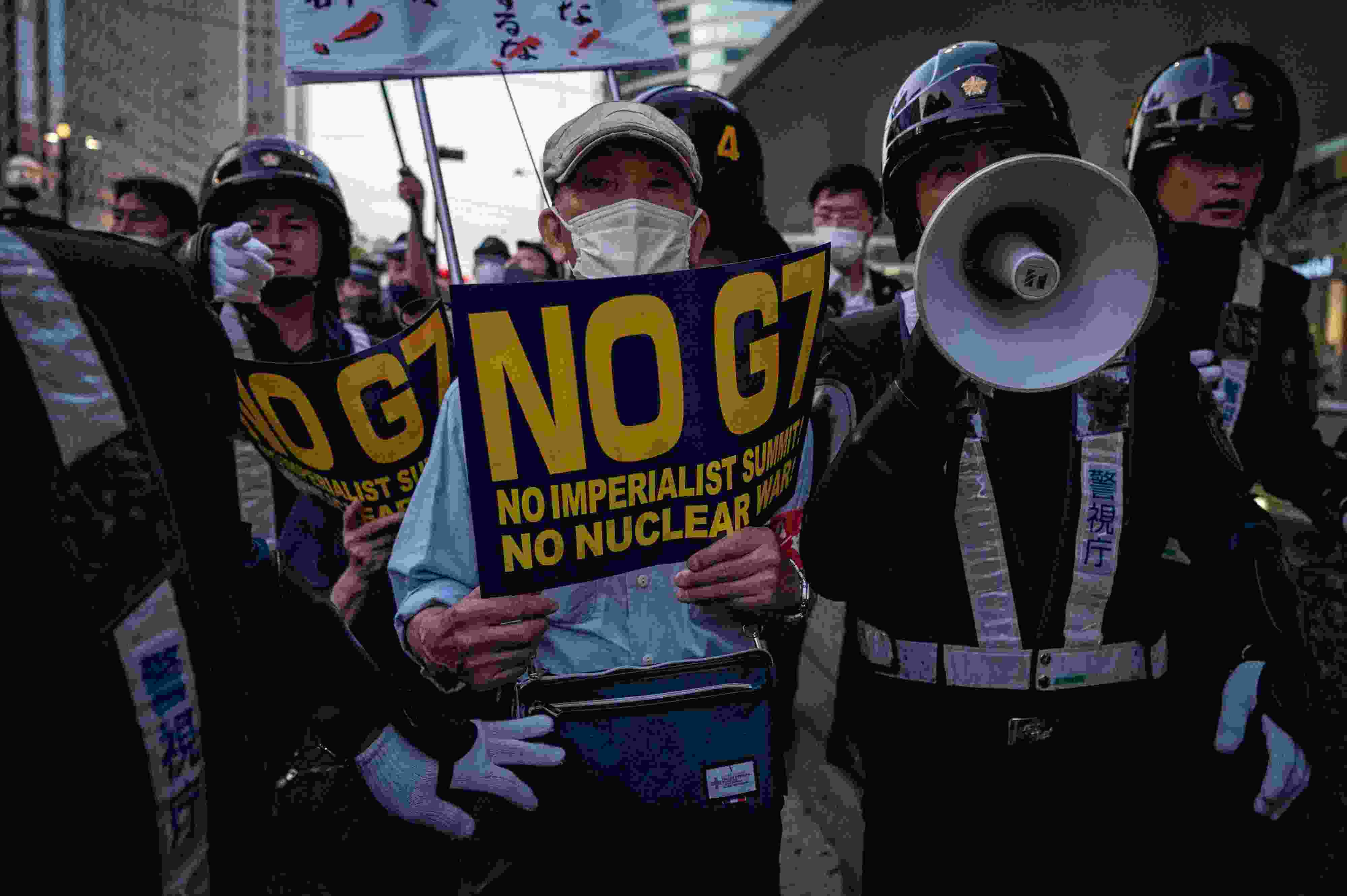 當(dāng)?shù)貢r間2023年5月17日,日本廣島,日本民眾舉著各式標(biāo)語,在廣島和平紀(jì)念公園原子彈轟炸遺址舉行集會,強烈抗議七國集團(G7)峰會將在廣島召開。 視覺中國