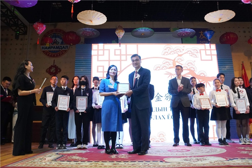 柴文睿在致辭中表示,駐蒙古使館始終關(guān)注旅蒙華僑蒙中友誼學校的發(fā)展,并給予大量關(guān)心和支持,希望全校師生抓穩(wěn)接力棒,繼續(xù)將學校建設(shè)成蒙中友誼的典范。他鼓勵學生們再接再厲,積極投身中文學習,深入了解中國文化,將來成為促進和傳承中蒙友誼的棟梁之才。