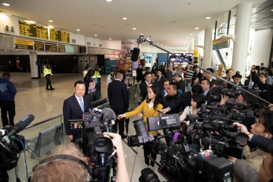 5月23日,中國新任駐美大使謝鋒抵美履新。在紐約機場,謝鋒與在場的中外媒體及各界人士交流互動。