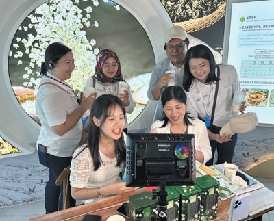 廣西橫州市茉莉花展館內,工作人員在直播展示茉莉花特色產品,東盟青年加入其中并向網(wǎng)友們問好。本報記者 戴楷然攝