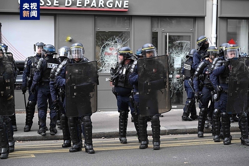 在法國首都巴黎,游行隊伍下午3點左右從北站平靜出發(fā)后,隨后一個由數(shù)百名蒙面男子組成的隊伍破壞了銀行機構(gòu)的櫥窗,并向一輛警車投擲石塊。巴黎警察局稱,這輛汽車遭到“鐵棍”的打擊。車上一名警察手持武器下車,以便與示威者保持距離。一支摩托車警察部隊隨后趕來,阻止了破壞行為并保護了車上的警察。