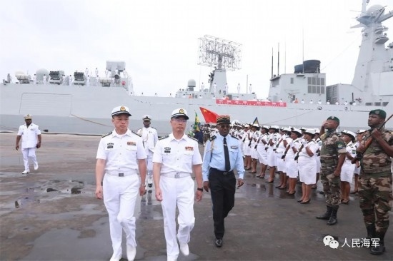 編隊(duì)艦艇靠泊后,編隊(duì)指揮員和李津津大使同加蓬主要領(lǐng)導(dǎo)互致問(wèn)候,并在加蓬海軍儀仗隊(duì)隊(duì)長(zhǎng)的陪同下檢閱了加蓬海軍儀仗隊(duì)。