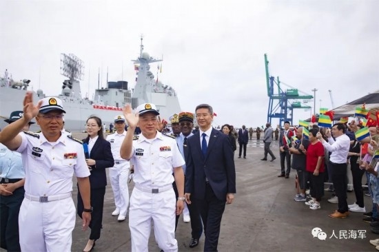 當(dāng)日上午9時(shí),懸掛著中加兩國(guó)國(guó)旗的編隊(duì)艦艇緩緩靠泊奧文多港碼頭,中國(guó)駐加蓬大使李津津及使館工作人員、當(dāng)?shù)刂匈Y機(jī)構(gòu)人員、華人華僑代表,加蓬國(guó)防部秘書(shū)長(zhǎng)彭吉中將及官兵代表等300余人位碼頭迎接。
