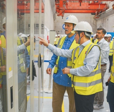 巴基斯坦卡洛特水電站是中巴經(jīng)濟(jì)走廊首個(gè)水電投資項(xiàng)目,由中國(guó)三峽集團(tuán)投資開(kāi)發(fā)建設(shè),運(yùn)營(yíng)一年來(lái)節(jié)約標(biāo)準(zhǔn)煤約140萬(wàn)噸,減少二氧化碳排放約350萬(wàn)噸。圖為中方技術(shù)人員向來(lái)訪(fǎng)的巴基斯坦代表團(tuán)介紹水電站運(yùn)行情況。本報(bào)巴基斯坦分社 薩義德·邁赫迪攝