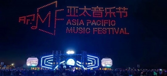 在氣氛最熱烈的時候,500架無人機(jī)緩緩升空,列隊(duì)表演,不斷變換陣型,時而在空中呈現(xiàn)出“亞太音樂節(jié)”、“中國外文局亞太傳播中心”、“太仆寺旗歡迎您”等巨幅字幕,時而呈現(xiàn)吉他、音符、蒙古包等色彩繽紛的圖案。