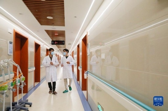 甘肅中醫(yī)藥大學(xué)針灸推拿專業(yè)的塔吉克斯坦留學(xué)生紀(jì)明哲(左)和土庫(kù)曼斯坦留學(xué)生迪達(dá)在甘肅中醫(yī)藥大學(xué)附屬醫(yī)院的病房外交流(7月27日攝)。新華社記者 陳斌 攝