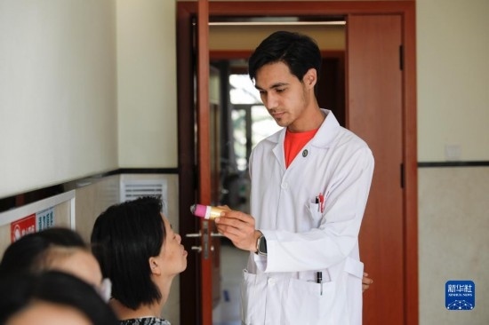 甘肅中醫(yī)藥大學(xué)針灸推拿專業(yè)的土庫(kù)曼斯坦留學(xué)生迪達(dá)(左)在臨床實(shí)習(xí)中為患者檢查眼睛(7月28日攝)。新華社記者 方欣 攝