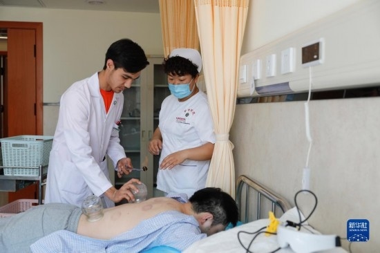 甘肅中醫(yī)藥大學(xué)針灸推拿專業(yè)的土庫(kù)曼斯坦留學(xué)生迪達(dá)(左)在甘肅中醫(yī)藥大學(xué)附屬醫(yī)院護(hù)士的指導(dǎo)下為患者進(jìn)行拔罐治療(7月28日攝)。新華社記者 方欣 攝