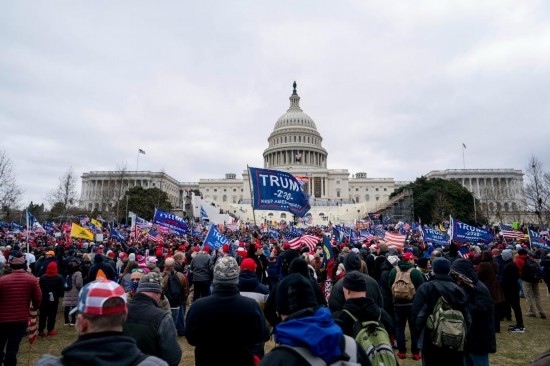 2021年1月6日,在美國首都華盛頓的國會大廈前,時任總統(tǒng)特朗普的支持者舉行示威游行。部分示威者沖擊國會大廈,導(dǎo)致國會參眾兩院認(rèn)證總統(tǒng)選舉結(jié)果的聯(lián)席會議中斷數(shù)小時。事件造成4名示威者和1名國會警察死亡。新華社記者劉杰攝