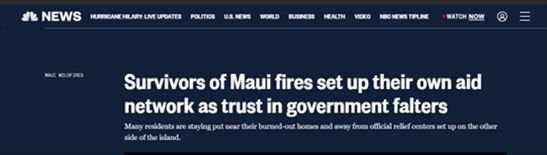 《紐約時報》8月14日報道,聯(lián)邦緊急事務(wù)管理局要求人們在網(wǎng)站上注冊后才能獲得臨時住房等援助,但是毛伊島西部受災(zāi)最嚴(yán)重地區(qū)目前依然處于斷電斷網(wǎng)中,那里的災(zāi)民根本無法登錄網(wǎng)站。