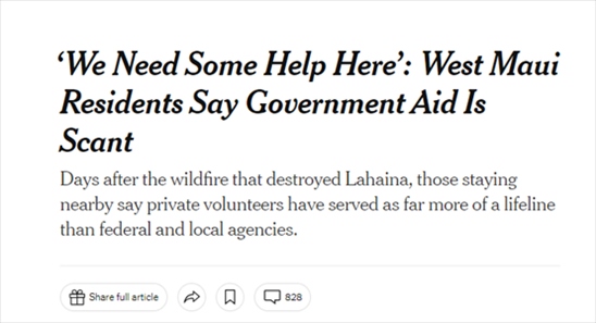 《紐約時報》8月13日發(fā)表報道稱,毛伊島野火造成2200多幢建筑倒塌,許多受災(zāi)居民缺少熱食、飲用水和庇護所。災(zāi)難發(fā)生后,當(dāng)?shù)刂驹刚呓M成了比聯(lián)邦和地方機構(gòu)更可靠的“生命線”。有居民表示,從聯(lián)邦和地方政府手中得到的救助遠(yuǎn)沒有從私人志愿者處得到的多。
