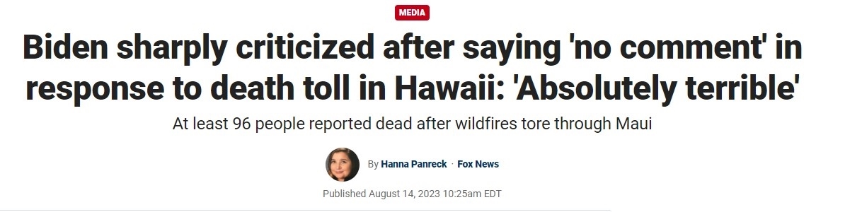 福克斯新聞網(wǎng)8月14日報道稱,當(dāng)?shù)貢r間13日上午,毛伊島救災(zāi)仍在進行,美國總統(tǒng)拜登卻在其位于特拉華州里霍伯斯海灘的海邊別墅過周末。當(dāng)被問及毛伊島大火造成的死亡人數(shù)正不斷上升的問題時,拜登表示“不予置評”。