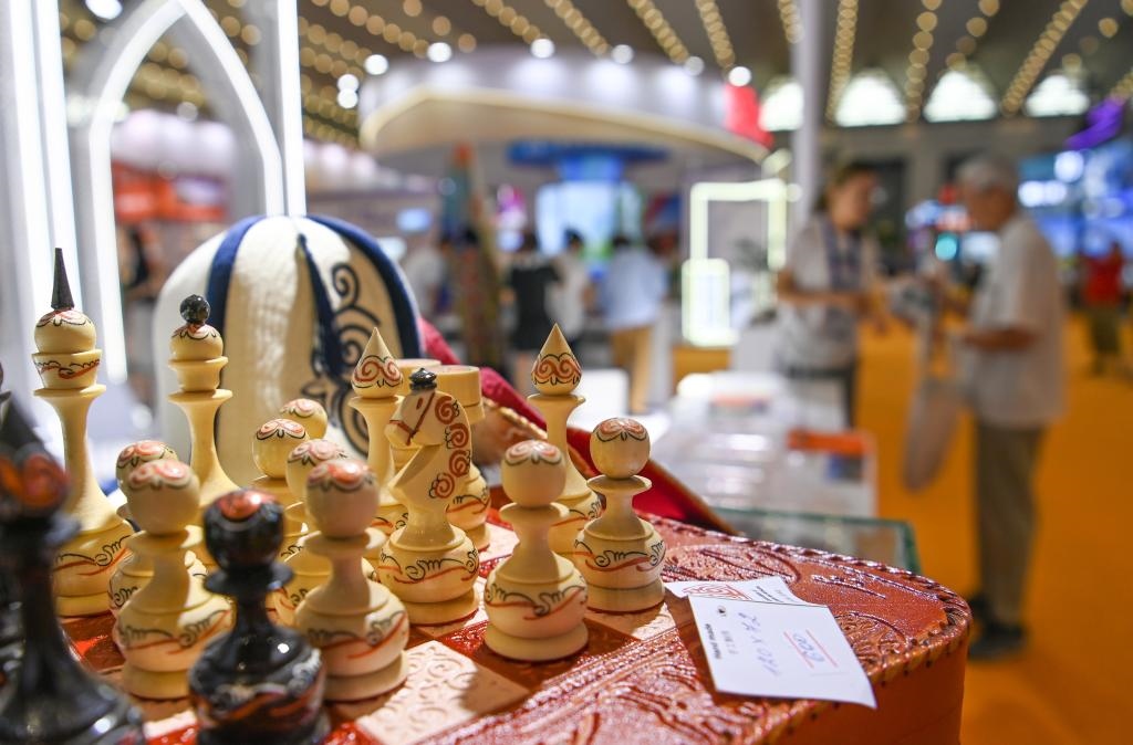 8月19日,參觀者在交流合作館吉爾吉斯斯坦展區(qū)了解特色商品。新華社記者 鄒競一 攝