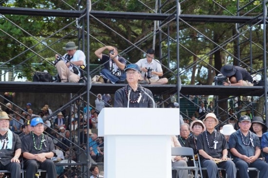 2016年6月19日,在日本沖繩縣首府那霸市一座公園內,時任沖繩縣知事翁長雄志(前)發(fā)表講話。新華社記者沈紅輝攝