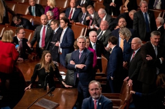 這是1月6日在美國(guó)華盛頓國(guó)會(huì)拍攝的凱文·麥卡錫(中)。新華社記者劉杰攝