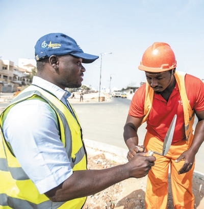 ?塞內(nèi)加爾達喀爾快速公交項目是塞內(nèi)加爾第一條城市快速公交線路。這條長約18公里的道路將穿過達喀爾人口密度最高的社區(qū)和核心商務(wù)區(qū),建成后有助于緩解首都交通壓力。圖為當(dāng)?shù)貑T工在項目建設(shè)工地交流。新華社記者 李亞輝攝