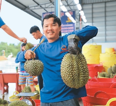 春蓬府位于泰國南部,距離曼谷400多公里,是泰國南部最大的榴蓮種植區(qū)。泰國榴蓮主要種植于東部和南部地區(qū),東部榴蓮上市時間較早,集中在4月至6月,而南部稍晚,于6月至9月成熟收獲。春蓬府農(nóng)業(yè)局局長素班告訴記者,今年南部榴蓮總產(chǎn)量63萬噸,其中春蓬府約33萬噸。素班說,泰國榴蓮近80%銷往國際市場,中國市場占總出口量90%以上。
