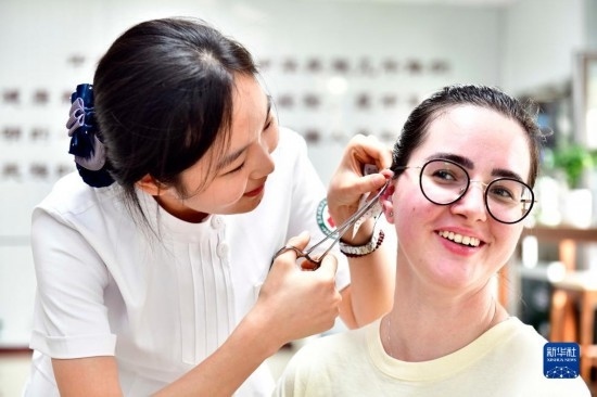 10月18日,在青島西海岸新區(qū)中醫(yī)醫(yī)院,山東科技大學(xué)國(guó)際交流學(xué)院斯洛伐克籍留學(xué)生夢(mèng)娜在體驗(yàn)中醫(yī)傳統(tǒng)療法耳穴壓丸。