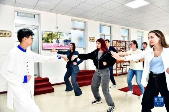 10月18日,在青島西海岸新區(qū)中醫(yī)醫(yī)院,來(lái)自山東科技大學(xué)國(guó)際交流學(xué)院的留學(xué)生在學(xué)習(xí)八段錦。