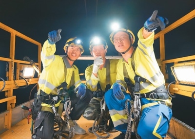 中國師傅潘貴(右)帶領(lǐng)老撾徒弟馮圖(左)以及馮圖的徒弟康更(中)一同登乘軌道車作業(yè)。