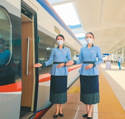 在中老鐵路老撾萬象站,中老方乘務(wù)員按照中國鐵路乘務(wù)標(biāo)準(zhǔn),迎接世界各國旅客。