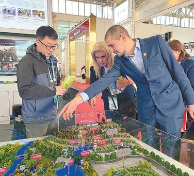 外國(guó)參展商在了解節(jié)水灌溉系統(tǒng)。本報(bào)記者 呂鐘正攝