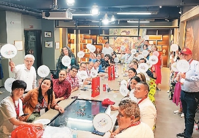 “漢語(yǔ)橋”哥倫比亞教育工作者訪華團(tuán)組到天津楊柳青古鎮(zhèn)體驗(yàn)?zāi)戤嬛谱鳌?/p>