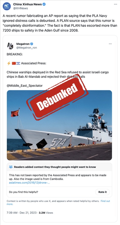 一個(gè)名為“Megatron”的擁有十多萬(wàn)“粉絲”的賬號(hào)在社交平臺(tái)“X”(原推特)上說(shuō):“美聯(lián)社突發(fā)新聞!中國(guó)軍艦在曼德海峽拒絕協(xié)助以色列貨船,且無(wú)視他們的呼救。”貼文后還配了一張中國(guó)軍艦的照片。