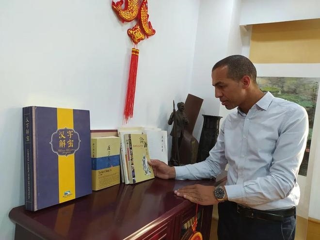 阿巴斯向記者介紹中國(guó)文化相關(guān)書(shū)籍。黃培昭攝