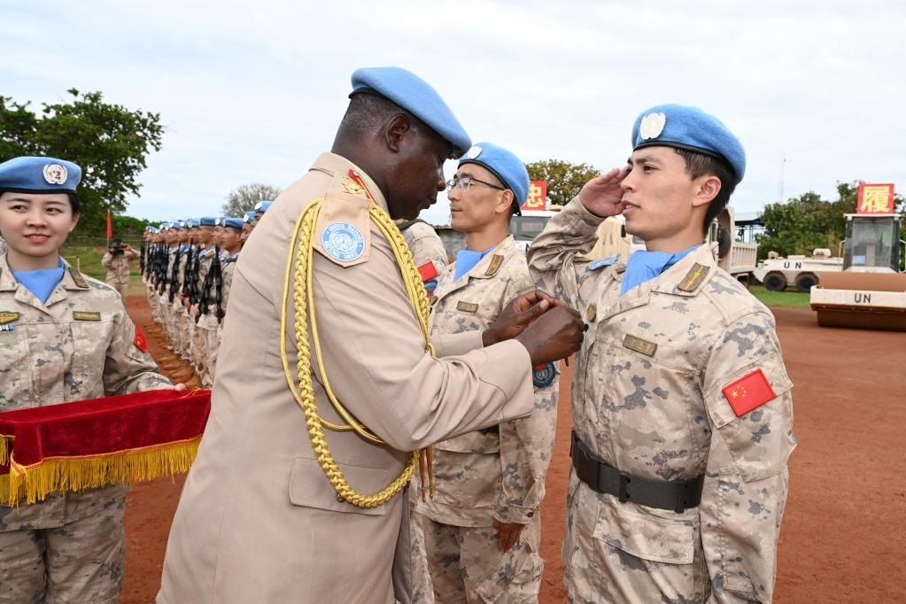 2023年10月28日,在聯合國駐南蘇丹特派團瓦烏超級營地的中國工兵營區(qū),聯南蘇團西戰(zhàn)區(qū)司令哈根(中)在授勛儀式現場授予中國維和官兵聯合國“和平榮譽勛章”。新華社發(fā)(李飛宇攝)