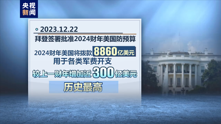 一方面美國(guó)政府財(cái)政長(zhǎng)期入不敷出,一方面美國(guó)軍費(fèi)開(kāi)支也在節(jié)節(jié)攀升。2023年12月22日,美國(guó)總統(tǒng)拜登簽署批準(zhǔn)了2024財(cái)年美國(guó)國(guó)防預(yù)算。根據(jù)預(yù)算,2024財(cái)年美國(guó)將撥款8860億美元用于各類(lèi)軍費(fèi)開(kāi)支,較上一財(cái)年增加近300億美元,該數(shù)額為歷史最高。