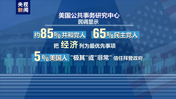 民調(diào)顯示,約76%的美國(guó)人希望政府著力解決與經(jīng)濟(jì)有關(guān)的問(wèn)題,與2022年12月75%的占比相差無(wú)幾。約85%的共和黨人和65%的民主黨人把經(jīng)濟(jì)列為最優(yōu)先事項(xiàng)。民調(diào)還顯示,僅有5%的美國(guó)人“極其”或“非?!毙湃伟莸钦?。