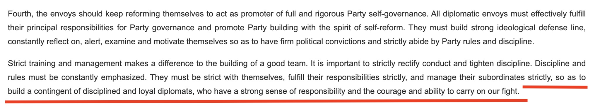 “鐵軍”一詞常見于政府文件或領(lǐng)導(dǎo)人講話,更多的是強(qiáng)調(diào)工作作風(fēng)和紀(jì)律。在近年來中國領(lǐng)導(dǎo)人講話中,曾多次出現(xiàn)“紀(jì)律監(jiān)察鐵軍”“生態(tài)環(huán)境保護(hù)鐵軍”等表述。中國領(lǐng)導(dǎo)人在接見與會(huì)使節(jié)時(shí)的講話中說:“打造一支對黨忠誠、勇于擔(dān)當(dāng)、敢斗善斗、紀(jì)律嚴(yán)明的外交鐵軍?!蓖饨徊烤W(wǎng)站對這句話的英文翻譯(見下圖)同樣強(qiáng)調(diào)外交隊(duì)伍的紀(jì)律、責(zé)任和勇氣。作為通行做法,世界各國對本國外交人員都有著很高的紀(jì)律要求。