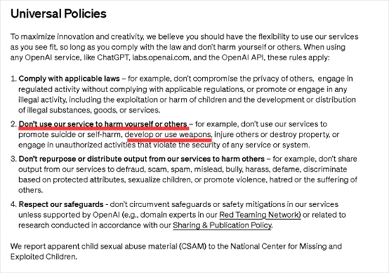 然而,在1月10日對(duì)其使用條款進(jìn)行一番大更新后,OpenAI公司雖然在禁止項(xiàng)中仍然提到禁止將其產(chǎn)品、模型和服務(wù)用于會(huì)導(dǎo)致人員傷亡的用途上,并提到了“武器開(kāi)發(fā)和使用”,但先前同樣被禁止的軍事用途,如今卻在文本中消失了。
