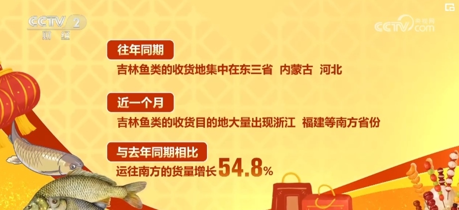 南方水果運(yùn)往北方的同時(shí),北方的堅(jiān)果、水產(chǎn)和鮮奶運(yùn)送到了南方。從訂單數(shù)據(jù)看,吉林魚類的收貨地在往年都集中在東三省、內(nèi)蒙古、河北。然而在最近一個(gè)月,收貨的目的地大量出現(xiàn)了浙江、福建等南方省份,跟2023年同期相比,運(yùn)往南方的貨量增長了54.8%。