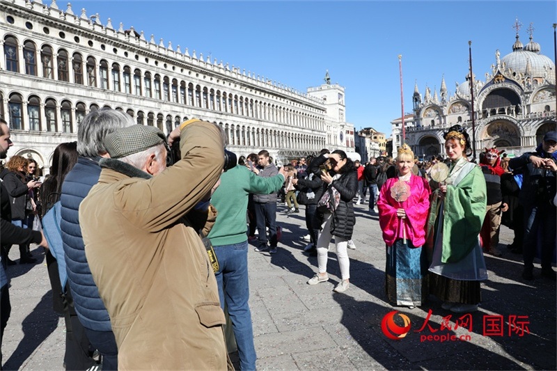 據介紹,這次參與巡游的服飾,是從蘇州絲綢博物館郵寄過來的,有融合蘇州絲綢元素的清麗典雅的傳統服飾,也有端莊大氣的宋錦新中裝。上午十點半,由22名中意志愿者組成的漢服巡游隊伍從威大孔院向圣馬可廣場行進。志愿者們身著不同朝代的漢服并配以精致的妝發(fā),成為威尼斯街巷中一道靚麗的風景線,吸引了許多沿途民眾的目光。
