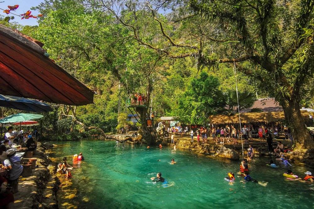 2月14日,中國游客在老撾萬榮藍色瀉湖游玩。
