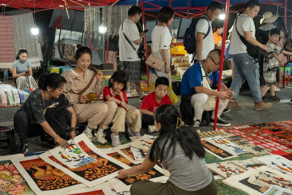 2月16日,游客在老撾瑯勃拉邦夜市上購買當?shù)貍鹘y(tǒng)手工藝品。