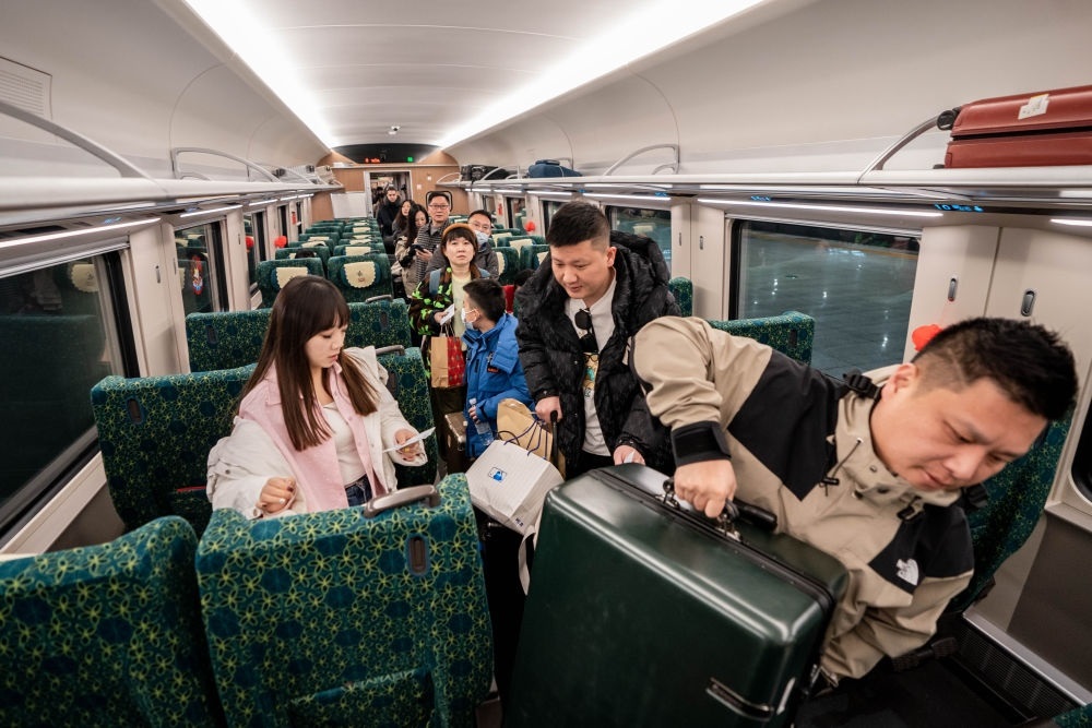 2月14日,游客在昆明南站乘坐中老鐵路國際旅客列車準備前往老撾旅游。