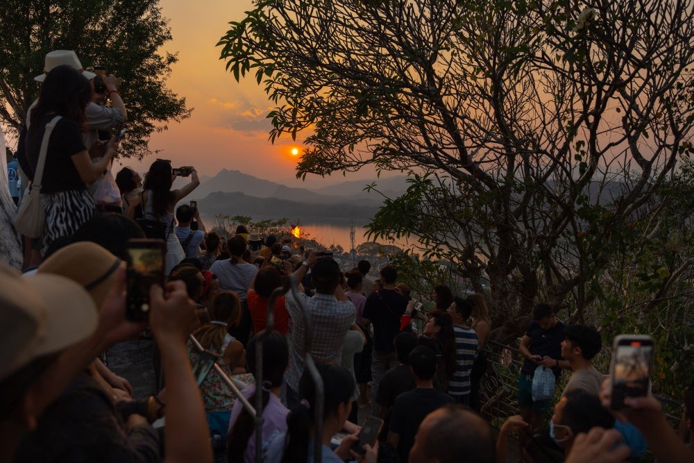 2月16日,在老撾瑯勃拉邦普西山山頂,游客在觀賞落日景觀。湄公河畔、老撾北部群山環(huán)繞的瑯勃拉邦在14到16世紀間曾是老撾歷史上第一個統(tǒng)一的多民族國家瀾滄王國的首都?,槻罟懦?995年被聯(lián)合國教科文組織列入世界文化遺產(chǎn),如今已經(jīng)成為老撾歷史與文化的象征。