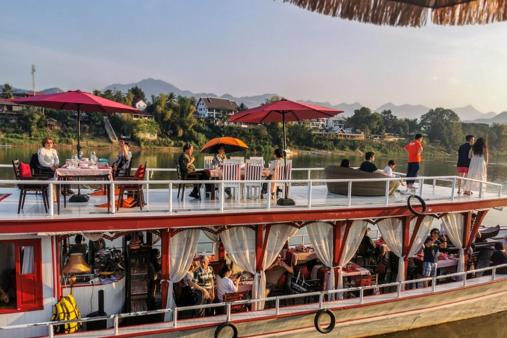 2月12日,中國游客在老撾瑯勃拉邦乘船游覽湄公河。