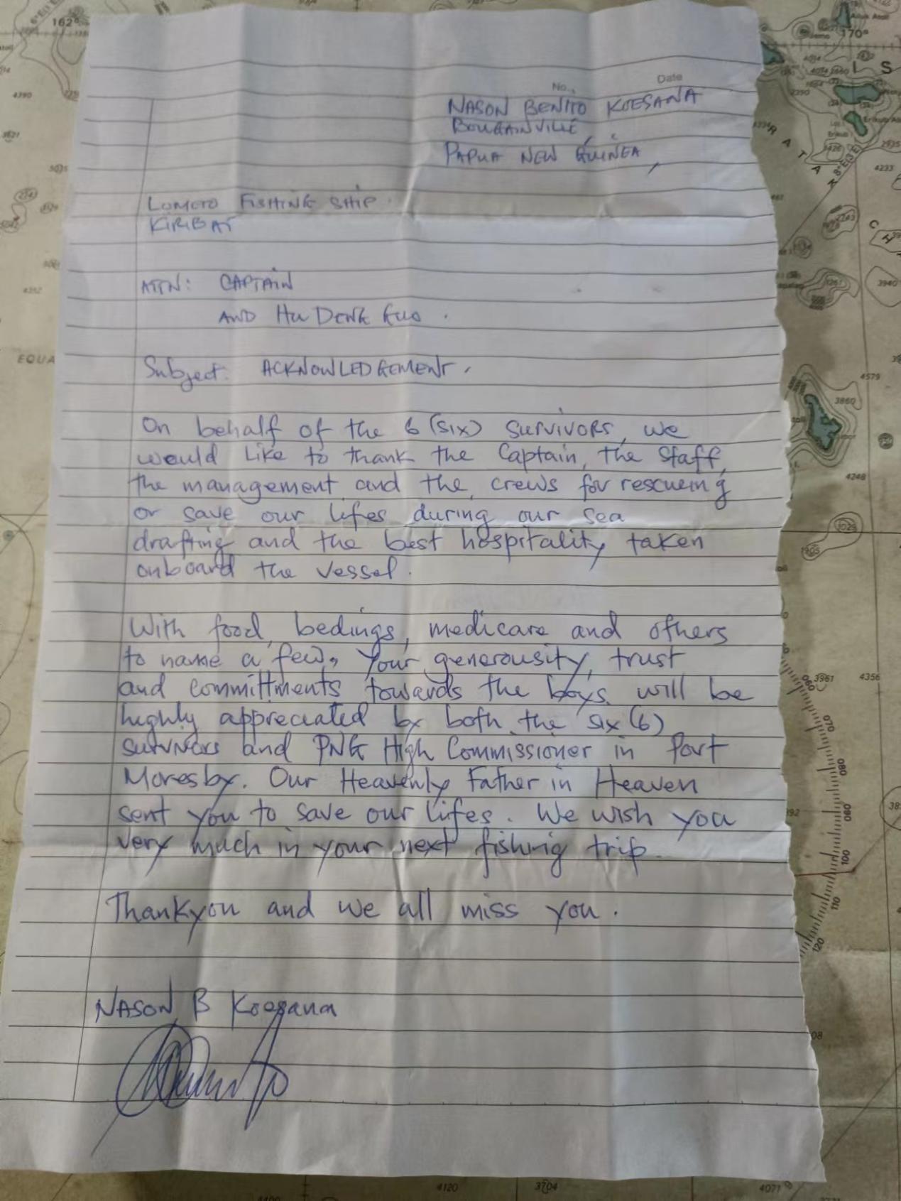 內(nèi)森·本特羅·科埃薩納代表被救的全體6名巴新遇險(xiǎn)人員,專(zhuān)門(mén)寫(xiě)了感謝信,向中國(guó)漁船船長(zhǎng)及船員表示感謝。感謝信寫(xiě)道:“當(dāng)我們?cè)诤I掀鲿r(shí),船長(zhǎng)和船員拯救了我們的生命,我們?cè)诖鲜艿搅俗詈玫目畲#ㄖ袊?guó)漁船給我們提供了)食物、床上用品、醫(yī)療救助等,我們6名幸存者及莫爾茲比港的巴新高級(jí)專(zhuān)員都高度贊賞你們對(duì)我們的慷慨、信任和奉獻(xiàn)?!?/p>