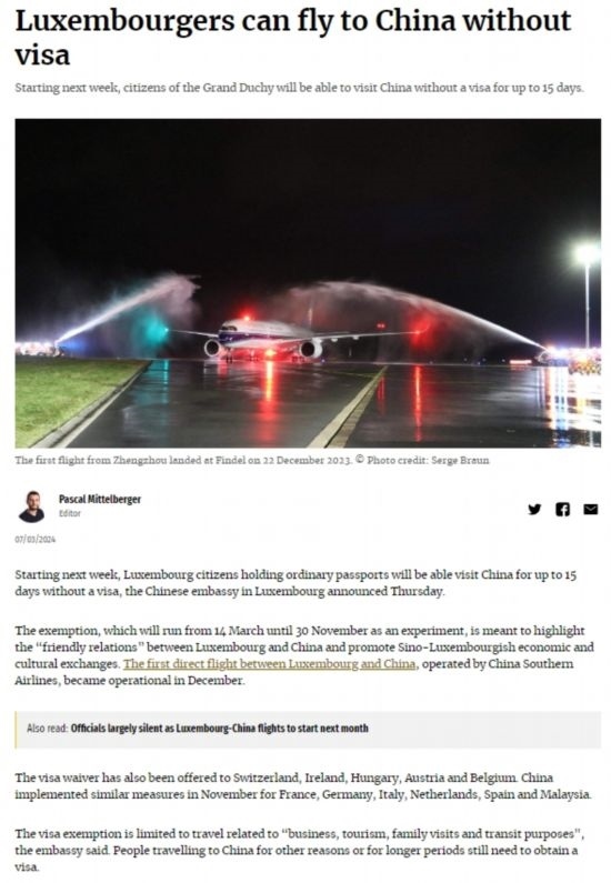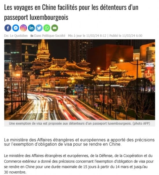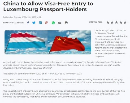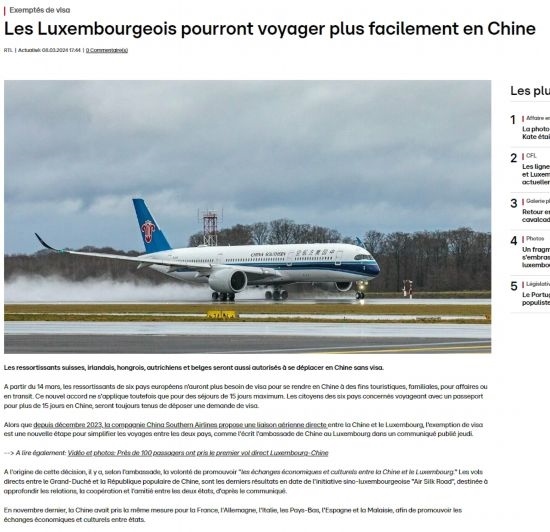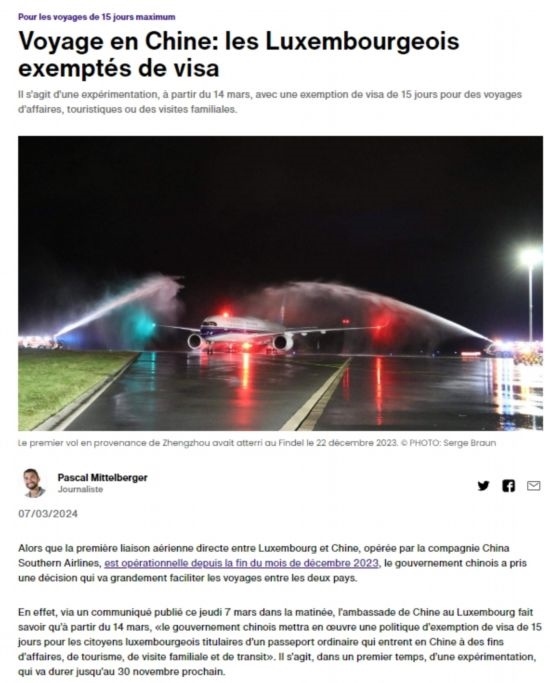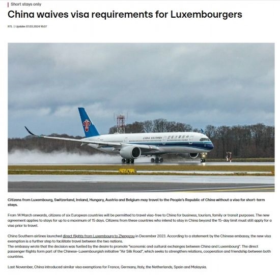 近日,中國(guó)政府決定自2024年3月14日0時(shí)起至2024年11月30日24時(shí),對(duì)包括盧森堡在內(nèi)的6國(guó)持普通護(hù)照人員實(shí)行部分免簽。中國(guó)駐盧使館及時(shí)向盧外交部等部門和主流媒體作了通報(bào),盧政府和媒體對(duì)中方免簽政策予以高度評(píng)價(jià)。