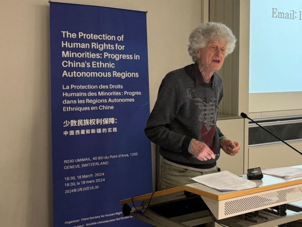 ?3月18日,由中國人權(quán)研究會主辦的“少數(shù)民族權(quán)利保障:中國西藏和新疆實踐”主題講座在瑞士日內(nèi)瓦舉行。圖為比利時知名藏學家安德烈·拉克魯瓦在講座上發(fā)言。新華社記者石松攝