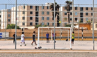 當(dāng)?shù)厍嗌倌暝陧椖糠叫藿ǖ淖闱驁鰞?nèi)踢球。