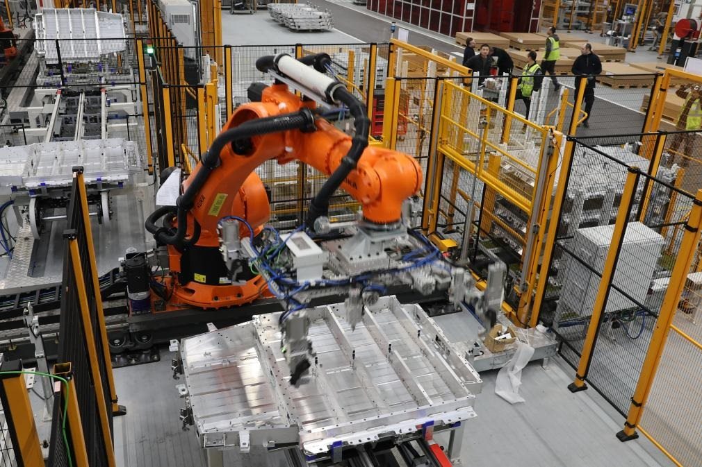2月23日,在法國(guó)呂茨,搬運(yùn)機(jī)器人在中國(guó)敏實(shí)集團(tuán)與法國(guó)雷諾集團(tuán)成立的合資公司的電池盒產(chǎn)線上工作。新華社記者張百慧攝