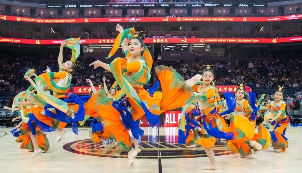 2月14日,舊金山華人藝術(shù)團(tuán)演員在比賽中場(chǎng)為觀眾表演,歡慶中國(guó)農(nóng)歷新年。新華社發(fā)(董旭東攝)