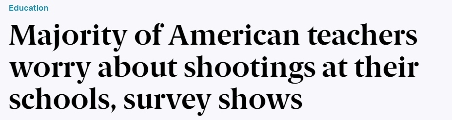 報(bào)道稱,2023年,美國發(fā)生的校園槍擊事件數(shù)量達(dá)到了歷史新高。在接受皮尤調(diào)查的受訪者中,59%的人對(duì)校園槍擊表示擔(dān)心,其中18%的人說自己對(duì)此感到“非?!被蛘摺皹O度”擔(dān)心。只有7%的受訪教師稱,他們完全不擔(dān)心校園槍擊的發(fā)生。