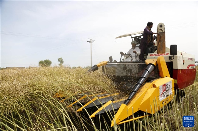 4月17日,一臺從中國引進(jìn)的油菜籽收割機在巴基斯坦東部旁遮普省珀格爾地區(qū)一處農(nóng)田進(jìn)行收割作業(yè)。新華社發(fā)(艾哈邁德·卡邁勒攝)
