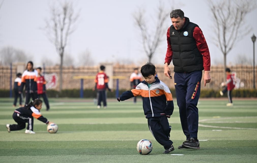 ?亞歷山大·潘蒂奇(右)在天津市靜海區(qū)華康街道第一小學指導小球員進行足球盤帶(3月6日攝)。新華社記者 孫凡越 攝